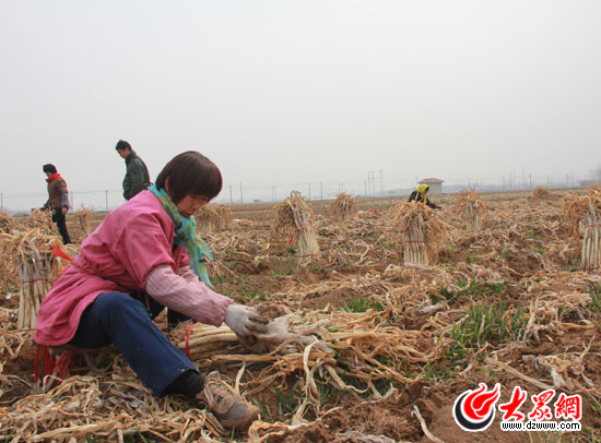 在章丘慶元村,村民們將大蔥刨出并捆好,準備發往河南市場。