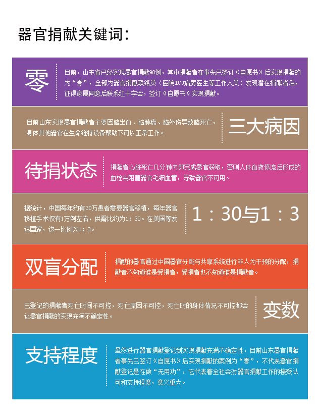自2010年10月,山東省作為全國人體器官捐獻首批試點省啟動器官捐獻工作至今,一共實現器官捐獻90例,但是90例中,由捐獻者自己事先申請登記后實現捐獻的為“零”,全部是由醫院中的“聯絡員”——ICU病房的醫生等工作人員發現符合條件的潛在捐獻者,經溝通后,由紅十字會工作人員去做家屬的工作,簽訂自愿書,最終實現了捐獻。