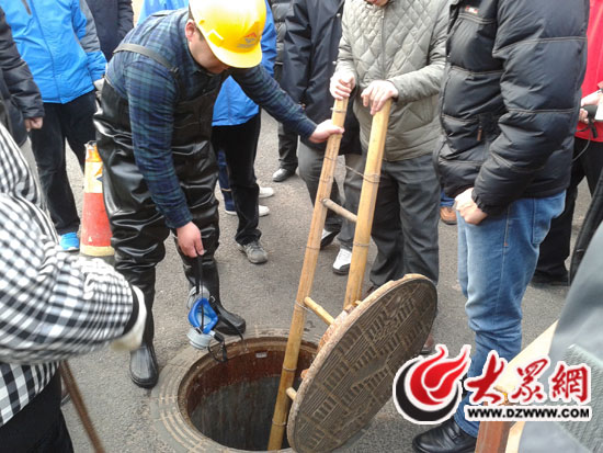 濟南環保、市政部門工作人員下井沿著涵洞尋找護城河污染源頭。大眾網記者 李兆輝 攝