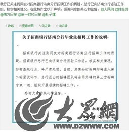 針對媒體與網友的質疑,招商銀行昨晚在官網和微博上發布了《關于招商銀行濟南分行畢業生招聘工作的說明》。回應稱:“招商銀行關注到網友對招商銀行濟南分行招聘工作的質疑。招商銀行總行已向濟南分行派駐工作組,核實相關情況。如有違規行為,將嚴肅處理。目前,濟南分行招聘即將進入第二輪面試環節,總行派出的招聘團隊將會同外聘的第三方招聘專家一起,組織開展后續的招聘工作。”