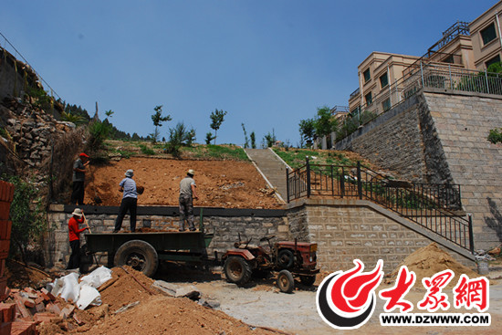 31日上午,記者在鳳鳴山莊三區(qū)現(xiàn)場看到,被挖護(hù)坡幾乎已經(jīng)看不出被破壞的樣子了,原先大坑的下方,一道擋土墻長度約6米,寬為1.2米,高度為2米的擋土墻高高筑起。現(xiàn)場有四五名工人,正在把停靠的一輛拖拉機(jī)上的渣土往護(hù)坡上填埋,原先挖空的山體已經(jīng)接近被填實(shí),只是護(hù)坡磚還沒有砌上。