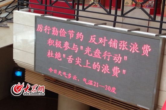 距中秋只有三天,山東新聞大廈餐飲訂單只有一份。圖為山東新聞大廈打出了“厲行勤儉節(jié)約,反對(duì)鋪張浪費(fèi)”的電子標(biāo)語