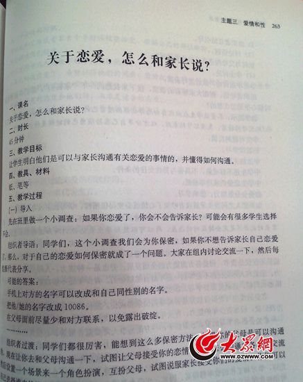 “以前聽過(guò)方剛老師在濟(jì)南的培訓(xùn)講座,感覺(jué)收獲很多,所以才要把這件事進(jìn)行下去。”3月12日,大眾網(wǎng)記者找到了濟(jì)南歷下區(qū)某中學(xué)的一位心理健康老師,他不僅全程參與了今年2月初方剛主講的《中學(xué)性教育教案庫(kù)》使用培訓(xùn),更向記者直言,書中不少案例早在一年多前便在濟(jì)南多所中學(xué)進(jìn)行了試講。這位老師告訴記者,2013年9月《中學(xué)性教育教案庫(kù)》一書尚在編寫之中,方剛老師受邀來(lái)濟(jì)主講性教育培訓(xùn)后,經(jīng)過(guò)協(xié)商,濟(jì)南教育部門參與了書中性教育案例的試講。“當(dāng)時(shí)有40多名中學(xué)老師,每人選擇幾個(gè)案例在各自學(xué)校試講,我們也是其中之一。”