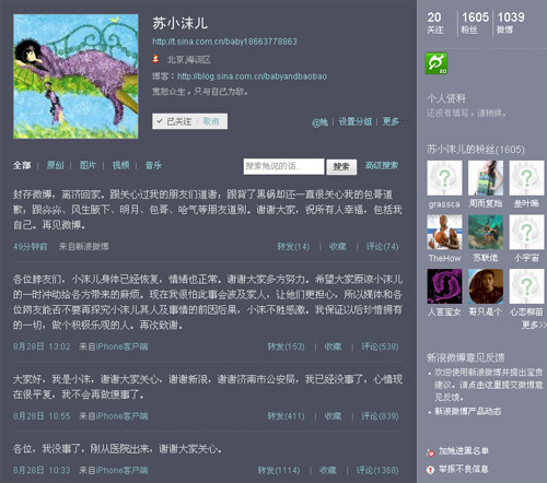 據“蘇小沫兒”微博顯示,自28日零時至8點19分,“蘇小沫兒”不間斷的發布微博約30余條。這些消息,均流露出了她的輕生念頭,并且在微博中詳細描述了采取“自殺”的方式。期間,數萬愛心博友通過微博消息對其安慰。