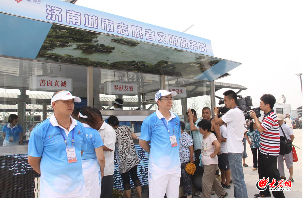 今天下午,濟南的氣溫達到35攝氏度,崗亭內的志愿者向前來乘車、參觀的市民免費發放飲用水,贏得了眾人的一致贊揚。