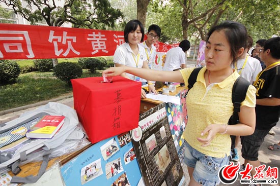 活動(dòng)吸引了山東經(jīng)濟(jì)學(xué)院許多學(xué)生的參與,不少學(xué)生捐獻(xiàn)出他們的書本和文具,現(xiàn)場(chǎng)還有不少大學(xué)生報(bào)名參加協(xié)會(huì)組織的暑期赴青海支教活動(dòng)。同學(xué)們?cè)诓噬埳蠈懮瞎膭?lì)青海小學(xué)生的寄語(yǔ),在“同飲黃河水、情系黃河源”的橫幅上寫下自己的名字。黃河源協(xié)會(huì)的楊舟同學(xué)介紹說(shuō),募捐活動(dòng)還吸引了來(lái)自濟(jì)南部落論壇網(wǎng)友的參加,同時(shí)還有許多社會(huì)上的熱心人加入了情系黃河源的活動(dòng)中。此次活動(dòng)募捐到的文具和善款將在協(xié)會(huì)今年暑期進(jìn)行的赴青海支教活動(dòng)時(shí),由志愿者親自送至學(xué)生手中。這次募捐活動(dòng)是黃河源協(xié)會(huì)16所高校聯(lián)盟成立后舉行的第一次大型募捐活動(dòng)。隨后各高校會(huì)分別舉行各種慈善活動(dòng),為青海的孩子們傳遞來(lái)自山東人的一份愛心。來(lái)自山東經(jīng)濟(jì)學(xué)院國(guó)際貿(mào)易學(xué)院的王停同學(xué)對(duì)記者說(shuō),他加入這個(gè)協(xié)會(huì)兩年了,期間參加了許多愛心活動(dòng);他希望能夠盡自己的一份力量,牽手祖國(guó)的西部,讓大家的愛心鼓舞在黃河源頭的孩子們好好讀書、實(shí)現(xiàn)夢(mèng)想。