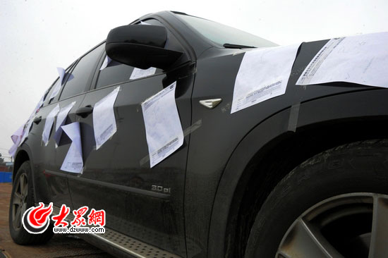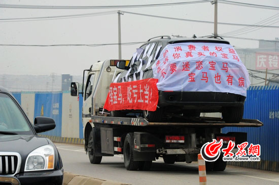 [提要] 29日,一位濟南寶馬車主在自己的“X5”維修30余次之后終于爆發,他將復印的維修單貼滿車身,用拖車將“X5”運到濟南萬寶行4S店門前。