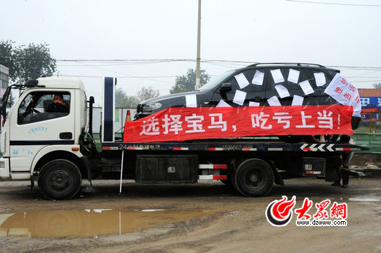 大眾網濟南9月30日訊(記者 燕雨)29日,一位濟南寶馬車主在自己的“X5”維修30余次之后終于爆發,他將復印的維修單貼滿車身,用拖車將“X5”運到濟南萬寶行4S店門前。
