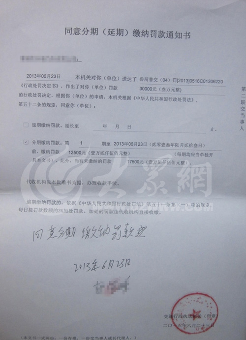 在帖子所附的《行政處罰決定書》上,大眾網記者看到,關于違法事實及證據一項寫著:檢查中發現,該車運輸一臺不可分解的大型設備。對該車運輸的大型設備進行了檢查測量,測量中發現該設備的寬度為4米。該車運輸的貨物為一級大型物件。該車主《道路運輸證》核定的經營范圍是:普通貨運。該車不具備運輸大型物件的資格。以上事實違反了《道路貨物運輸及站場所管理規定》的規定,依據《道路貨物運輸及站場管理規定》第六十三條第三項:超越許可的事項,從事道路貨物運輸經營的應處以30000元以上99000元以下罰款的規定,決定給予處罰款叁萬元整(¥30000)的行政處罰。在《同意分期(延期)繳納罰款通知書》上則寫明,罰款分兩期交,第一期為12500元,第二期為17500元。