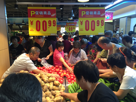 西紅柿0.79元一斤,黃瓜、土豆0.99元一斤,西瓜0.59元一斤……開業當天,記者看到,超市內 大量商品當日都低于市場價,引來大批的市民排隊購買。除此之外,該超市還有多種促銷活動!皬 18號到24號,我們有好幾個優惠活動,22號和24號兩天,每天前300名進店購物的顧客,免費領取5枚 雞蛋,同時,購物滿額還有面條、水杯和不銹鋼盆贈送!痹撋顝V場相關負責人告訴記者,該超市是 民營超市里裝修高端的,價格優惠的。“我們的理念就是讓老百姓用菜市場的價格購買到高品質的產 品,同時享受高端的購物環境。”