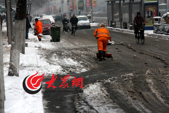 雖然早上5點(diǎn)起,城管部門就已經(jīng)開始撒融雪劑,但大眾網(wǎng)記者在現(xiàn)場(chǎng)看到,車流量較少的副道以及人行道依然被冰雪覆蓋,騎電動(dòng)車和自行車出行的市民幾乎全部垂著雙腳掌握平衡,控制車速。“現(xiàn)在確實(shí)有點(diǎn)滑,等會(huì)有灑鹽水的車來(lái)給積雪灑水,灑完鹽水后就會(huì)好多了!”在濼源大街清掃積雪的環(huán)衛(wèi)工說(shuō)。