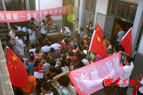 大眾網萊西8月10日訊(記者 趙永剛 趙洪棟)今天下午,山東選手張娟娟領銜的中國女子射箭隊再次向奧運金牌發起沖擊,萊西河頭店鎮抬頭村張娟娟家里國旗招展,人聲鼎沸,一百多名村民和各路記者聚集在這里,在電視機前共同為娟娟加油,為中國加油!