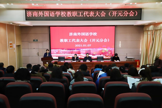 1月7日下午,濟南外國語學校開元國際分校教代會在學校報告廳隆重舉行,工會負責人彭春霞主任主持會議。