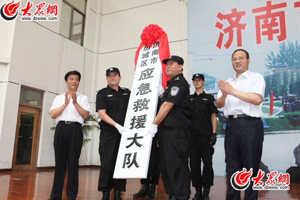 濟南市委常委、政法委書記、市公安局局長劉杰和歷城區委書記、區人大常委會主任李勝利為應急救援大隊揭牌。
