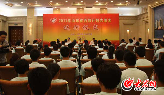 大眾網(wǎng)濟南7月25日訊(記者 趙洪棟)7月25日下午,2011年山東省西部計劃志愿者送行儀式在山東大廈隆重舉行。共青團山東省委書記王磊、共青團中央志愿者工作部副部長郭美薦等領(lǐng)導,以及120名即將奔赴新疆的2011年我省西部計劃首批志愿者出席了送行儀式。