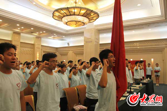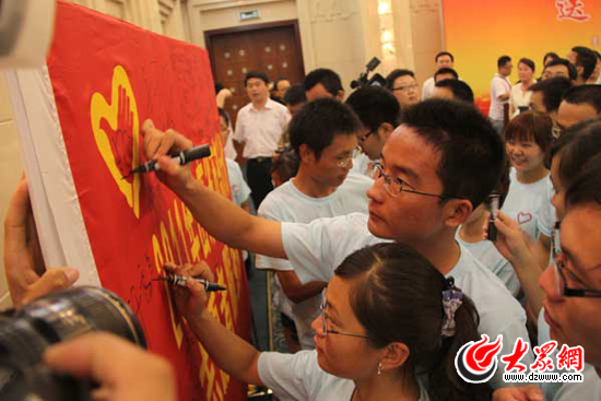 儀式上,志愿者們集體莊嚴宣誓,立志牢記責任,不辱使命,全力以赴,在服務(wù)西部的大舞臺上奉獻熱情、揮灑激情、展現(xiàn)風采。高校老師代表和志愿者家長代表為2011年山東省西部計劃志愿者送上了情真意切的祝福和寄語。儀式結(jié)束后,與會領(lǐng)導、志愿者在2011年西部計劃志愿者服務(wù)隊隊旗上簽字留念。
