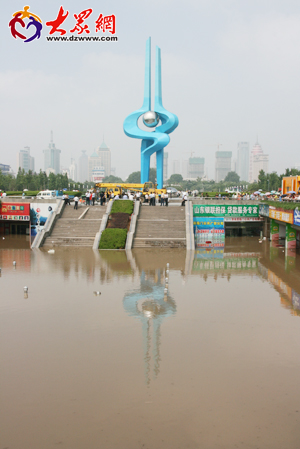 今天上午9點,記者趕到泉城廣場,泉標東側(cè)下沉廣場兩側(cè)已經(jīng)聚集了很多市民,記者看到,整個下沉廣場已經(jīng)成了一個大水池,水面上漂浮著很多貨物,只有廣場燈柱的頂部還露在外面,估計水深在兩米左右,十余臺水泵正在緊張地向護城河內(nèi)排水。銀座購物廣場的各個入口均已封鎖,記者無法進入,但從上面可以清楚地看到里面的積水。