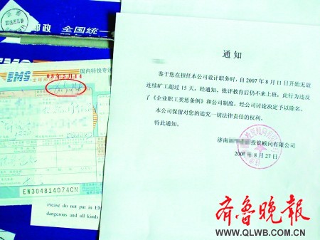 該通知的落款日期為2007年8月27日,即為蘇女士休產(chǎn)假后的第17天。“既然去年的8月27日就已經(jīng)把我除名,那后來(lái)又讓我去上班是什么意思?”看著這份“通知”,蘇女士百思不得其解。