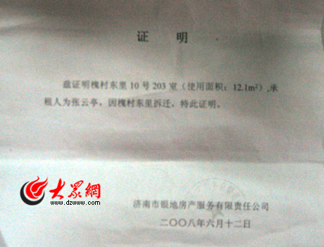 濟南市銀地房產服務有限公司向拆遷辦開具的證明(以上材料均為復印件)
