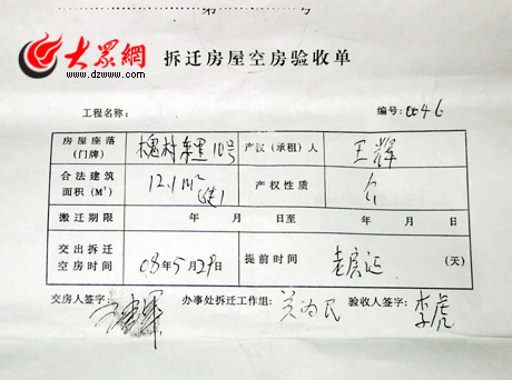 拆遷辦給王先生簽的空房驗收單