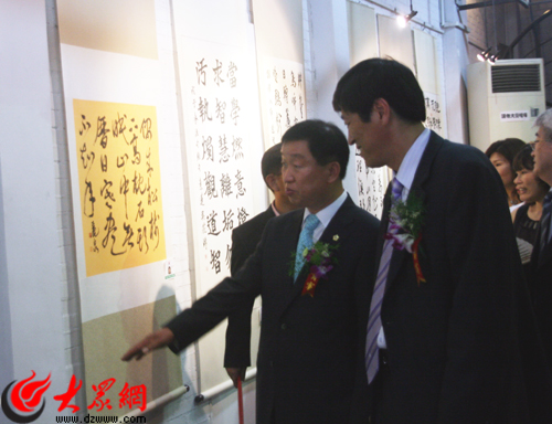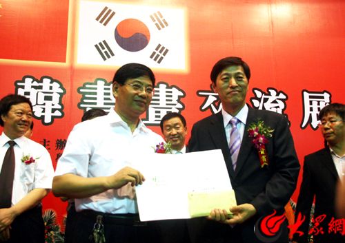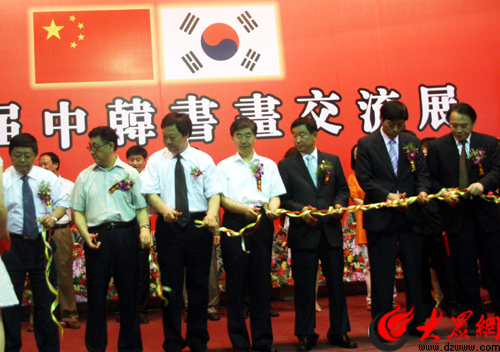 大眾網濟南6月22日訊(記者 趙永剛)今天上午,第六屆中韓書畫交流展在濟南東方現代藝術館開幕。省委宣傳部副部長、省文博會組委會副主任徐向紅,濟南市副市長張宗祥,濟南市政協副主席王可敏,濟南市原政協副主席、濟南市文聯主席吳澤浩和韓國水原市文化福祉委員會委員長金鐘基、韓國水原市書法協會會長盧福煥一行及社會各界人士200多人出席了開幕式。開幕式上,韓國水原書法協會向中國地震災區捐款1萬元人民幣。