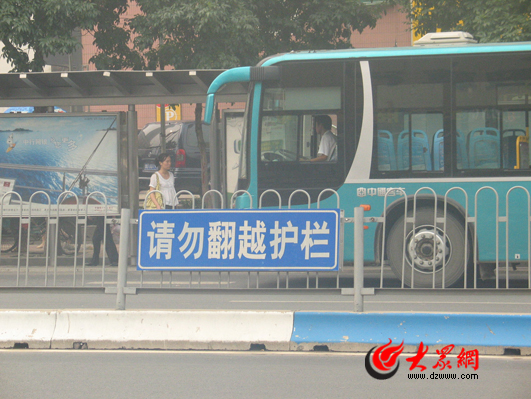行人翻越護(hù)欄后伺機(jī)跑向公交站牌