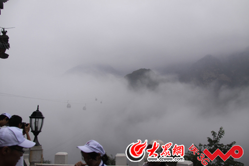 22日下午5點(diǎn)半,雨后泰山突現(xiàn)云山奇觀,泰山之巔遠(yuǎn)遠(yuǎn)望去,黑壓壓的云層像大山一般氣勢(shì),而索道上的纜車更像穿梭于大山之中。