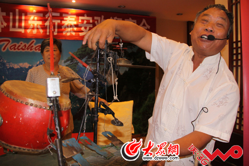 泰山皮影戲,老范稱之為“十不閑”,原因是擺弄皮影人兒、唱詞念曲、鼓樂伴奏……全由一人包攬,五官、四肢、頭腦(5+4+1=10)都不能閑著,看上去這像是在湊數,但看了老范的表演,卻覺得表演中的他全身都在動。一曲《石敢當除狼妖》表演完畢,著實讓大家領略到“天下一絕”的風范。