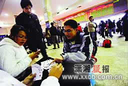 昨晚,長沙理工大學的學生胡帥和同學在售票廳里玩撲克打發時間,等待明天一早學生窗口開窗后買去鄭州的車票。