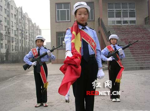 “拿美式槍,護咱的旗,咋看咋別扭!”23日晚上,網友“鍋爐工”在紅網論壇發帖爆料,稱在網易論壇、鐵血社區及貓撲大雜燴等網上看到一張雷人圖片:三小學生身穿交警服,其中兩名手拿M16自動步槍護旗。按說這應是仿真槍,可學校如此‘推陳出新’真把俺給嚇到了。不過,也有網友認為可能是有人擺拍的惡作劇,或表演什么的。