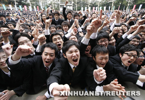 2月5日,在日本東京舉行的一個求職者集會上,大學生們振臂高呼,互相鼓勵并為自己加油。新華社/路透