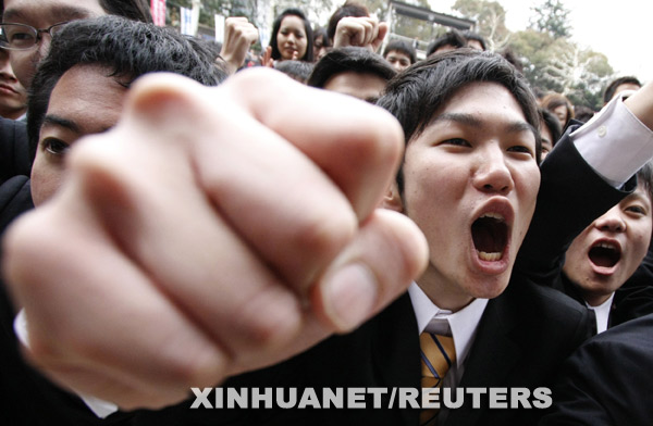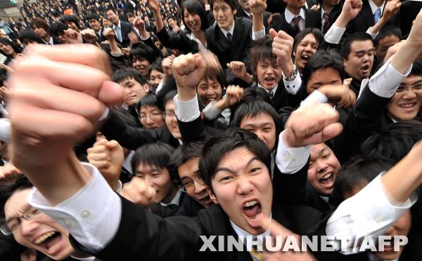 2月5日,在日本東京舉行的一個求職者集會上,大學生們振臂高呼,互相鼓勵并為自己加油。新華社/法新