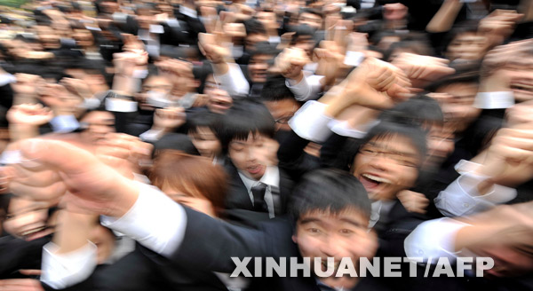 當天,約3000名畢業生聚集在這里,一同參加了這場別開生面的求職誓師大會,通過這一方式增強信心,鼓舞士氣,希望能在當前不景氣的經濟困境中找到立足之地。新華社/路透