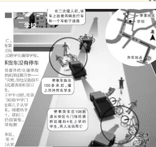 凱澤回憶說,外側并排騎行的是同學張田,后面是他表哥和另外一名女生。騎到搪瓷廠門口,他就聽到身后傳來“咚”的一聲,回頭一看,有輛貨車將表哥和女同學先后撞倒,卻沒減速,向南側緊急打方向,又直接撞到張田身上,并從他的腿部軋了過去。之后沖到逆行道上,繼續向西行駛。距離搪瓷廠100多米的地方,又撞上了兩名女學生后跑了。