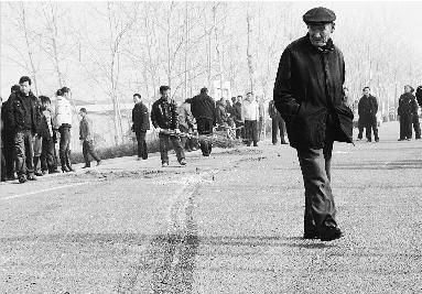 再往南走100多米路東,是事故另一個現場,遇難的兩個孩子同樣也被蓋著,只能隱約看到尸體趴在地上。孩子們的自行車倒在地上,后輪已嚴重變形。有村民不停地搖著頭,紛紛想象著事故發生的慘烈情景,一邊感嘆“太慘了”一邊咒罵著肇事司機。