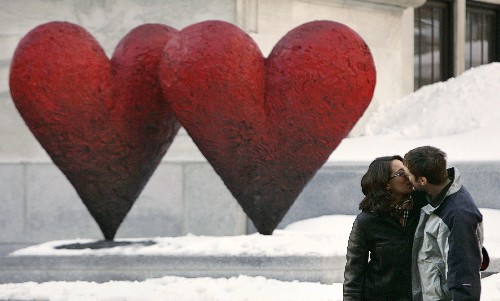 資料圖片:2005年2月13日,一對情侶在加拿大蒙特利爾一對心形雕塑前親吻。2月14日是情人節。世界各地的情侶們將以互贈紅玫瑰與巧克力、共進燭光晚餐、擁吻等形式慶祝這一浪漫節日。 新華社/路透