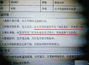 該網友在帖子中展示了她公司最近收到的一份求職簡歷的圖片。圖片顯示,求職的是一名來自鄭州大學的本科女生,專業是電子信息科學與技術。其中,最“雷人”的一部分在其自我評價一欄:“在大學期間被推舉為“宿舍舍長”并連任三年;細心謹慎,在鄭州生活三年多從來沒丟過錢包、手機或者個人證件。”