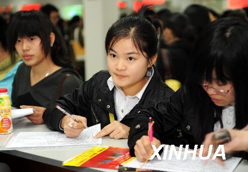 2月27日,幾位求職者在招聘會上填寫求職信息。 當日,由福州市婦聯、市人事局等單位聯合舉辦的2009年福州市女大中專畢業生就業供需見面會在福州金山人才交流中心舉行,60多家用人單位提供2000多個文秘、財務、護理等適合女性就業的工作崗位。新華社記者 姜克紅攝