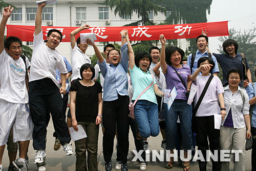 資料圖片:2008年6月9日,山東省實驗中學一批考生高考結束后在考場外歡呼雀躍。新華社發(呂傳泉 攝)