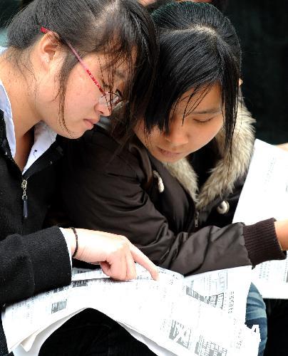 資料圖片:2月27日,兩名女大學生在了解用工信息。當日,由福州市婦聯、市人事局等單位聯合舉辦的2009年福州市女大中專畢業生就業供需見面會在福州金山人才交流中心舉行,60多家用人單位提供2000多個文秘、財務、護理等適合女性就業的工作崗位。新華社記者 張國俊攝