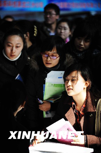 3月7日,幾位女大學(xué)生在一家用人單位應(yīng)聘。當(dāng)日,由哈爾濱市委組織部、哈爾濱市人事局主辦的2009哈爾濱春季高校畢業(yè)生就業(yè)暨項目建設(shè)人才招聘大會在哈爾濱國際會展體育中心舉行。本次招聘會為高校畢業(yè)生提供6000余個就業(yè)崗位,參會的應(yīng)聘人員突破5萬人。 新華社記者 王建威攝