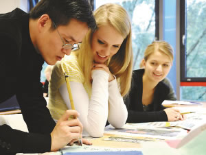 德國漢諾威孔子學院,德國中學生學寫毛筆字。