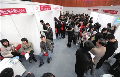 昨天(22日,下同),近幾年來本市首場中小學教師專場招聘會在首師大體育館舉行,1.3萬名北京高校應屆畢業生蜂擁而至,競爭132家本市中小學提供的1100余個崗位。在招聘現場,市區學校攤位前人頭攢動,而郊區學校則門可羅雀,兩極分化嚴重。