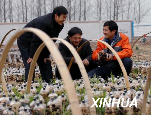 資料圖片:2009年3月24日,齊心征(右)向魚臺縣石集村返鄉農民工史中峰(中)以及從江蘇睢寧縣遠道而來學技術的農民高宏光講解越冬地栽式黑木耳的培養技術。齊新征1998年從山東電力高等學校畢業后自主創業,經過10年摸索,逐漸掌握了食用菌基本栽培技術和管理方法。目前,他在家鄉山東省魚臺縣唐馬鄉創辦的濟寧億佳農產品有限公司采取“公司+農戶”模式,統一購種、統一技術指導、統一回收、統一銷售,帶動周邊農戶和返鄉農民工共走致富路。新華社記者尹棟遜攝