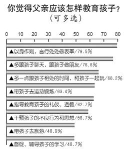 父親應該怎樣教育孩子?排在首位的是“以身作則,言行處處做表率”,79.5%的人選擇此項。接下來還包括:多跟孩子聊天,跟孩子做朋友(76.6%);多跟孩子相處,和孩子一起玩(66.2%);帶孩子去運動鍛煉(63.4%);指導教育孩子的禮儀、道德(62.7%);干預孩子的不良行為和思想(58.7%);帶孩子去旅游(48.7%);督促、輔導孩子的學習(43.4%)。