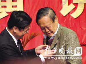 揚大校長為楊振寧佩戴揚州大學校徽。陳詠 攝