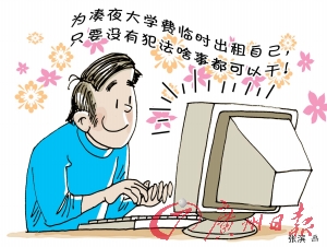 想上大學,卻無錢繳學費,于是心生一計,在網上發帖出租自己,并聲稱只要不是犯法的事什么都可以干。20日,在中山某論壇上,網友“乘風浪起”為湊夜大學費而臨時出租自己的帖子引發網友們關注。記者發現,除了少數網友對“乘風浪起”的行為表示理解外,大多網友對之“噓聲一片”。