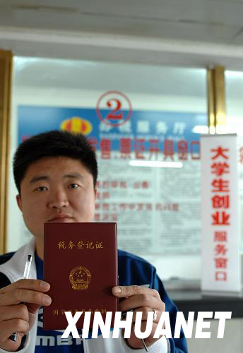 資料圖片:4月9日,在沈陽(yáng)市國(guó)稅局沈河區(qū)分局濱河稅務(wù)所,一位沈陽(yáng)農(nóng)業(yè)大學(xué)畢業(yè)生拿著剛辦好的稅務(wù)登記證。