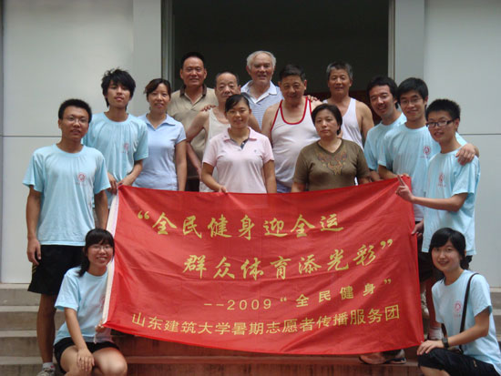 715日,山東建筑大學“全民健身迎全運,群眾體育添光彩”2009“全民健身”志愿傳播服務團走進濟南歷下區甸柳新區,與那里的居民舉行了“分享體育樂趣,共享社會和諧”主題健身活動,同時向那里的市民發放了“科學健身,健康生活”主題全運小報,用這種方法向市民此活動深受小區居民歡迎。