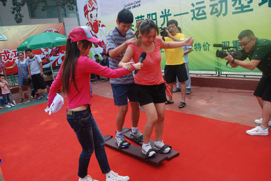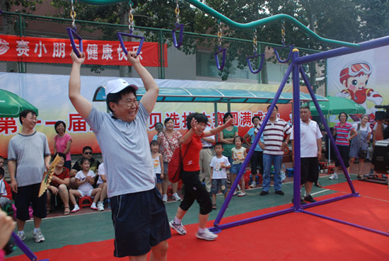 幼兒組的比賽口號(hào)為“全運(yùn)在身邊,家庭總動(dòng)員”,一家三口分別經(jīng)過“火線追擊”(幼兒獨(dú)立完成)——“凌波微步”(媽媽獨(dú)立完成)——“勢(shì)在臂行”(爸爸獨(dú)立完成)——“步調(diào)一致”(一家三口共同完成)四個(gè)環(huán)節(jié),用時(shí)短的獲得優(yōu)勝。